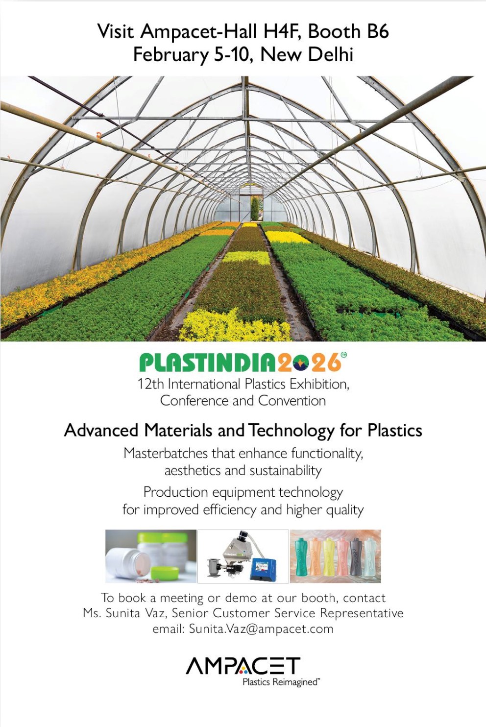 Global masterbatch leader Ampacet will feature advanced material and technology innovations for the plastics industry at Plastindia 2026, India’s premier plastics exhibition and conference, February 5-10 in New Delhi, India. Visit the Ampacet Booth B6 in Hall 4F to discover products that enhance design, performance, manufacturing and supply chain efficiency across blow molding, injection molding and film applications—tailored especially for key resins such as PP, PE and PET.
